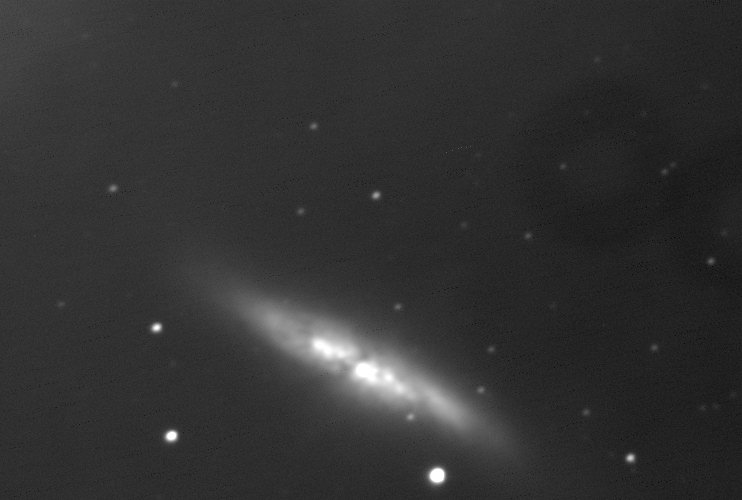 This is a combination of nine eight minute images taken with a Pictor 416XT. The Pictor was attached to an LX200 10" F/6.3 telescope. A Pictor 201XT was attached to an ETX for guiding. Each of the nine images was corrected with a dark frame and a flat field. After combining, the image was enhanced with logarithmic enhancement curve.